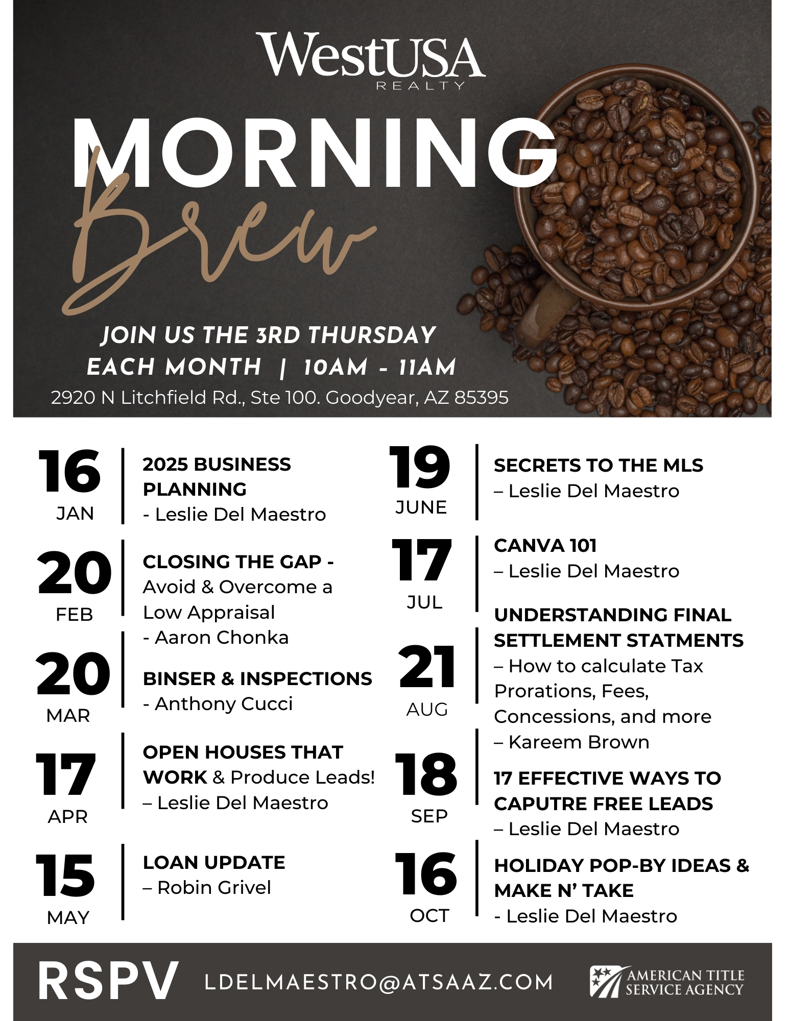 February 19 @ 10:00 am - 11:00 am Morning Brew, Coffee and Collaboration Morning Brew, Coffee and Collaboration Goodyear Office 2920 N. Litchfield RD Suite #100, Goodyear, AZ, United States RSVP: ldelmaestro@atsaaz.com or goodyear@westusareatly.com