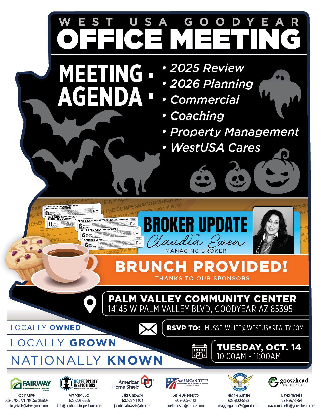 Featured October 16, 2025 @ 10:00 am - 11:00 am Morning Brew, Coffee and Collaboration Halloween Pop-By Goodyear Goodyear Office 2920 N. Litchfield RD Suite #100, Goodyear, AZ, United States RSVP: ldelmaestro@atsaaz.com or goodyear@westusareatly.com