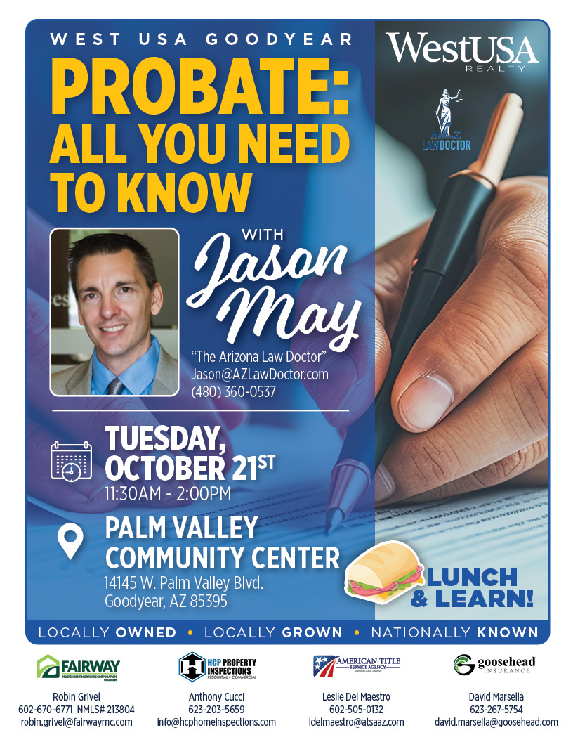 Featured October 21, 2025 @ 11:30 am - 2:00 pm LIVE CE Class: Goodyear Probate Class Palm Valley Community Center 14145 W Palm Valley Blvd, Goodyear, AZ, United States RSVP to jmusselwhite@westusarealty.com or goodyear@westusa.com