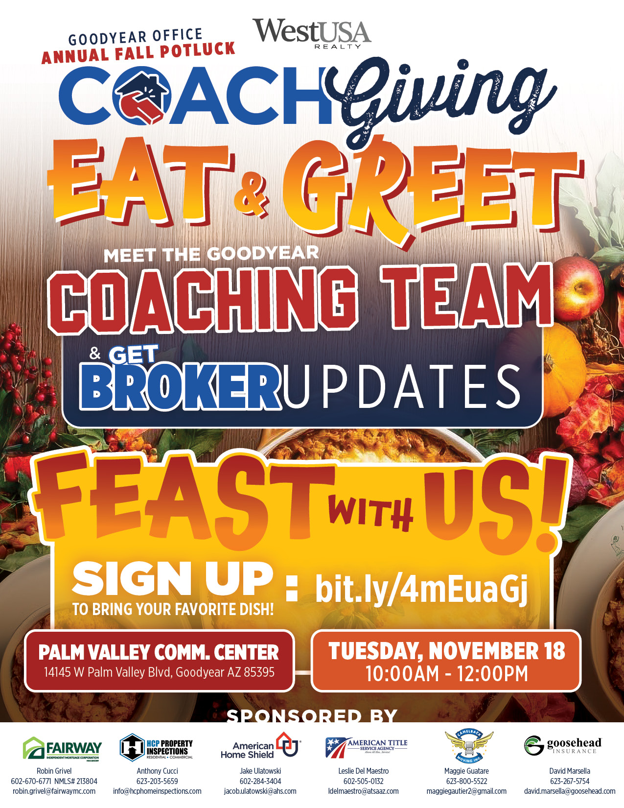 November 18, 2025 @ 10:00 am - 12:00 pm Goodyear Fall “Coach-Giving” Potluck Palm Valley Community Center 14145 W Palm Valley Blvd, Goodyear, AZ, United States For Food Sign Up Click HERE